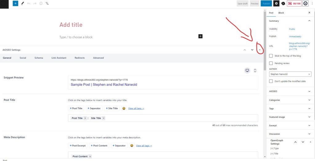 - This will be the most confusing part if you’ve never used WordPress to write a post before. When you first open the new post screen, there are several “Meta Boxes” that are open and take up most of the screen, even though they are only supposed to be there for “extra stuff”. For each meta box (one should be called AIOSEO Settings), look all the way to the right side to find the little up-facing triangle.